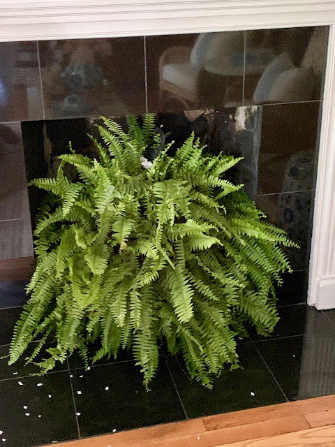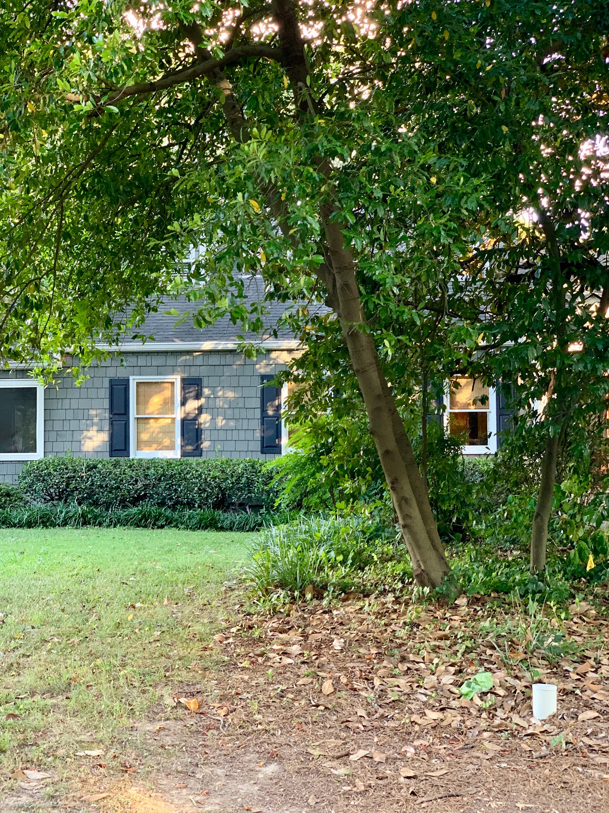 We had a some limbs cut and all the brush taken out. She is also having some rotten wood repairs and it is now painted darker with SW Peppercorn. I elected to remove the shutters....It's still ongoing as you can see...... the dormers aren't finished being painted yet. Those almost had to be totally re-done!