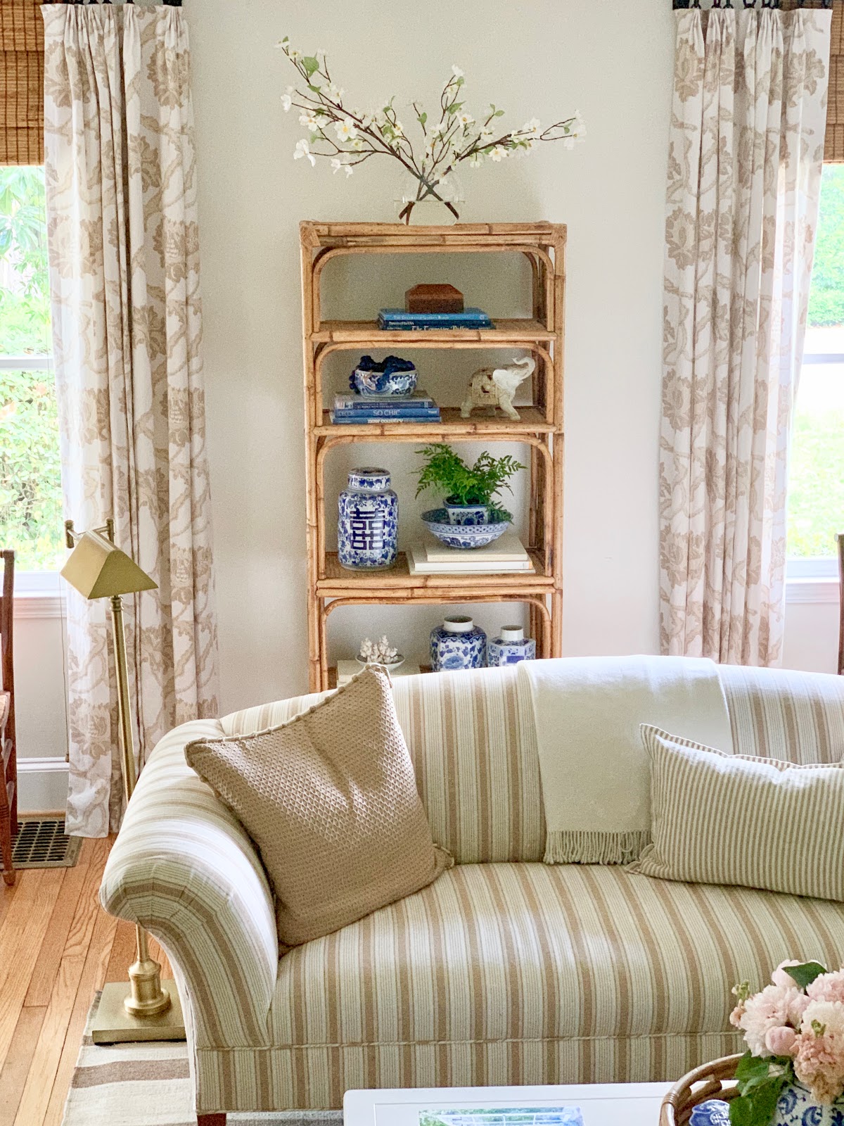 The prettiest dining room with those pink curtains!
