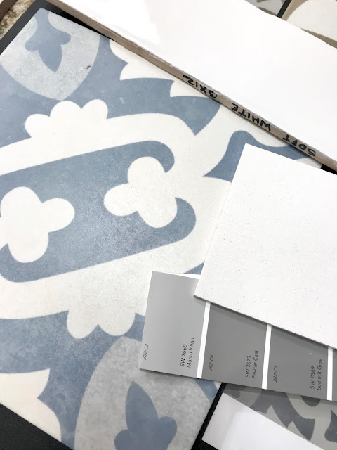 This is the bath tile on the floor with the vanity painted a soft gray...white Silestone countertops and white subway tile around the tub....