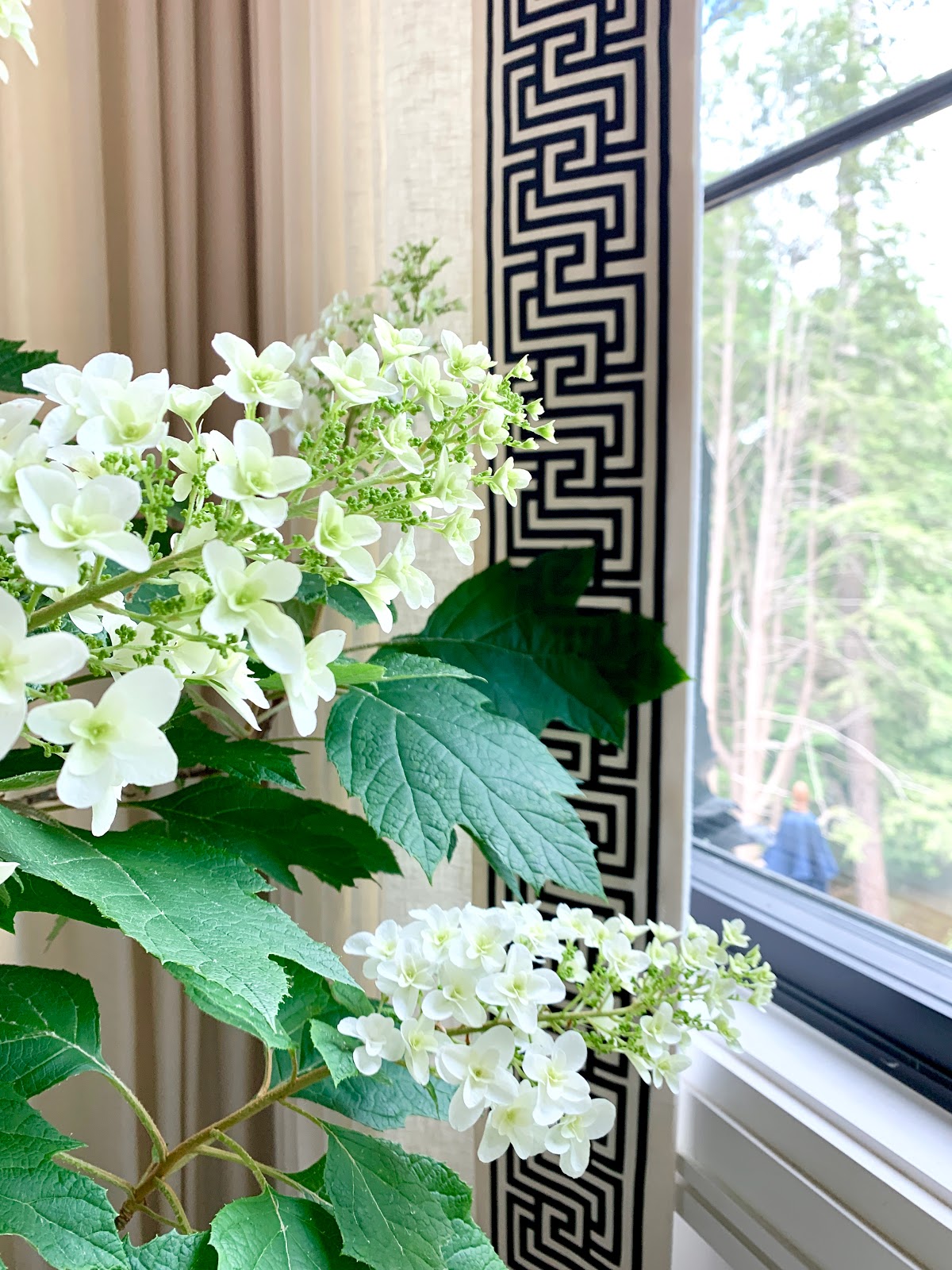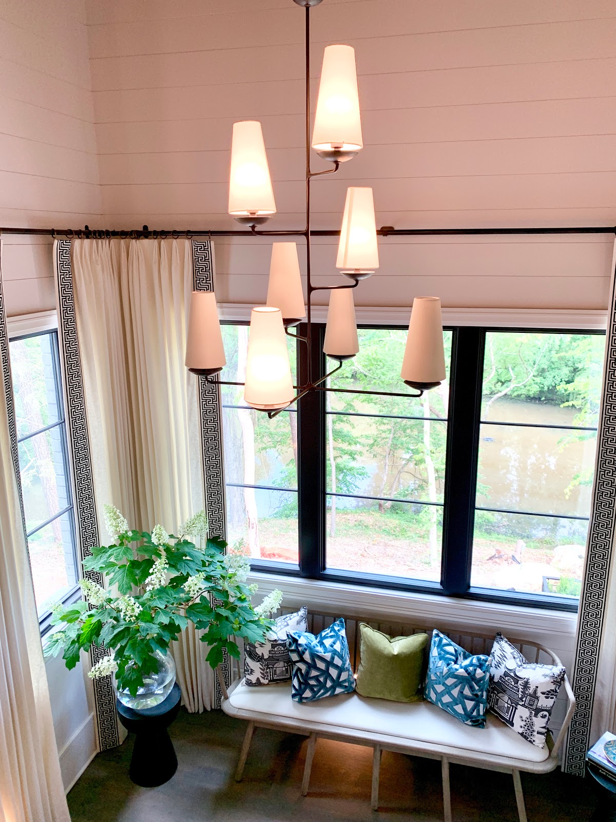Schumacher everywhere starting with these curtains and then in the bathroom with the wallpaper!